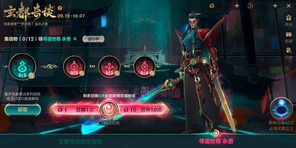 寻道世尊 永恩奖池召唤师使用1个或者10个“玄清玉帛”进行单次召唤或者10次召唤,可随机获得1份或10份奖励。不仅如此,拥有指定数量的玄都奇谈限定皮肤时,也可获赠信物,集齐12个信物即可领取首款终极皮肤:寻道世尊 永恩~