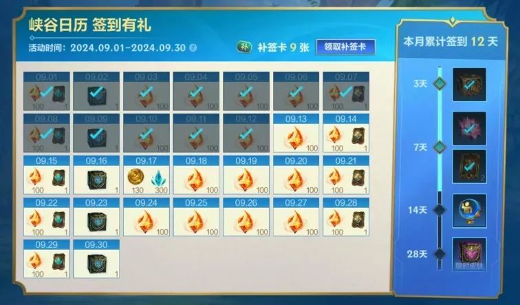 截止至9月30日,召唤师每日登录后,前往峡谷日历签到即可领取好礼!活动期间日历签到最多可获得龙魂水晶*2400、蓝色晶石*300及魄罗币*130奖励。