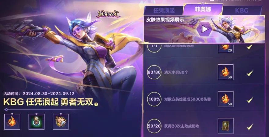 截止至9月12日(今日)23:59分,召唤师拥有KBG 任凭浪起 破浪 菲奥娜和KBG 任凭浪起 菲奥娜皮肤,即可领取限定回城特效-KBG·凯旋!参与活动完成任务,还可获得限定表情-冠军在此和龙魂水晶等奖励~