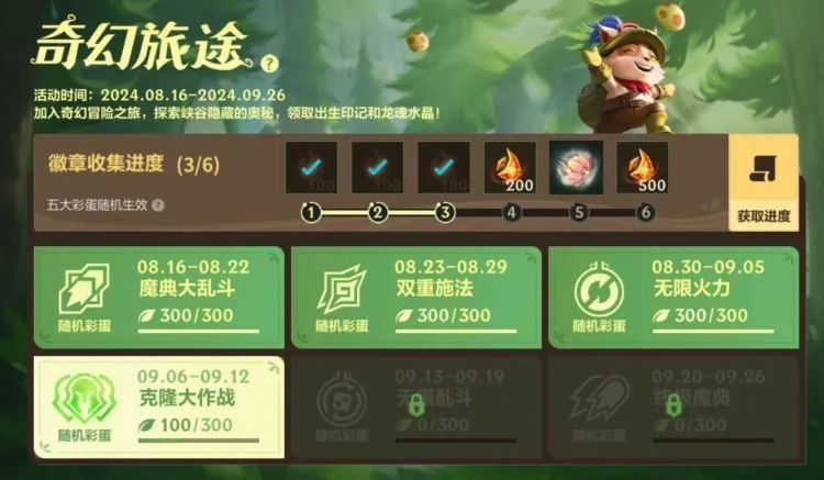 奇幻旅途第四站倒计时1天,截止至9月26日,召唤师完成任务积攒能量,即可助力徽章收集进度,领取出生印记-新枝桃彩和龙魂水晶*2800奖励~