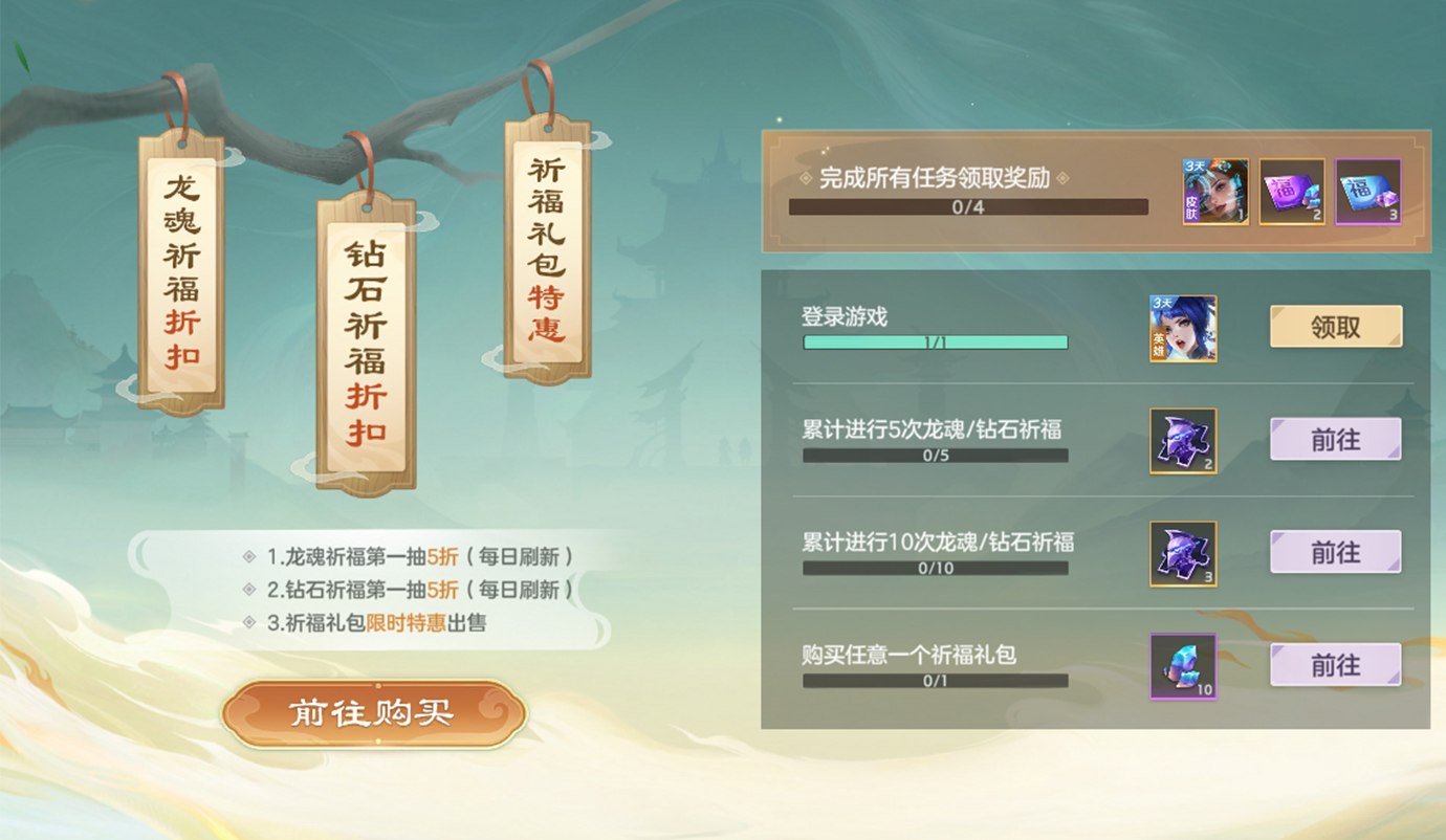 活动期间,钻石祈福、龙魂祈福限时第一抽五折(每日刷新)。完成任务,可获得嫦娥体验卡3天、皮肤碎片等奖励;完成全部任务,更可免费获得嫦娥·登月计划体验卡3天、龙魂祈福卡、钻石祈福卡等奖励