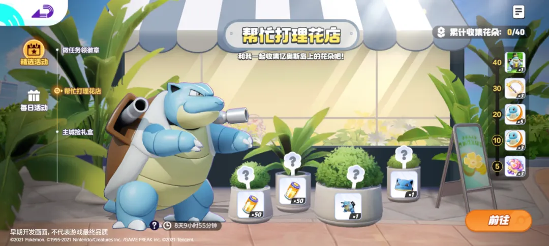 🔹累计收集对应数量的花朵必获得礼服风格水箭龟电子服(永久)、高级糖果、亿奥斯退化灯(杰尼龟)、普通烟花