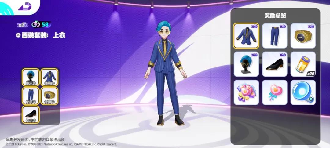 西装套装训练家时装(永久)、亿奥斯能量*20、高级糖果*1、亲密糖果*1、通用亿奥斯退化灯*1