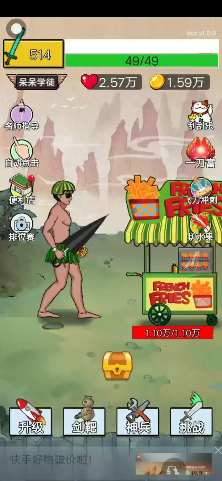 超好玩非常魔性的解压休闲游戏!玩家通过点击屏幕在控制游戏角色的攻击,屏幕点击的越快,角色攻击速度就越快。游戏中可挑战各种NPC,如:保安,九转肠王,强哥,水果葫芦娃等等比较有梗的角色。玩家在游戏中需要不断的挑战各种剑道高手,不断的提升自己的剑术,让自己变得更加强大,成为最牛的剑道高手,还有很多魔性搞笑的设计,为玩家带来全新的游戏乐趣。 1,游戏加入了很多网络热梗,让玩家在战斗过程获得更多的快乐。 2,内容丰富多彩,拥有很多趣味挑战玩法模式可以让玩家体验。 3,魔性搞笑的战斗场景设计,还有很多脑洞大开的武器可以让玩家选择。 玩起来非常有趣,各种魔性搞笑的对手可以让玩家挑战,还有非常不错的解压效果,喜欢的玩家朋友千万不要错过哦!