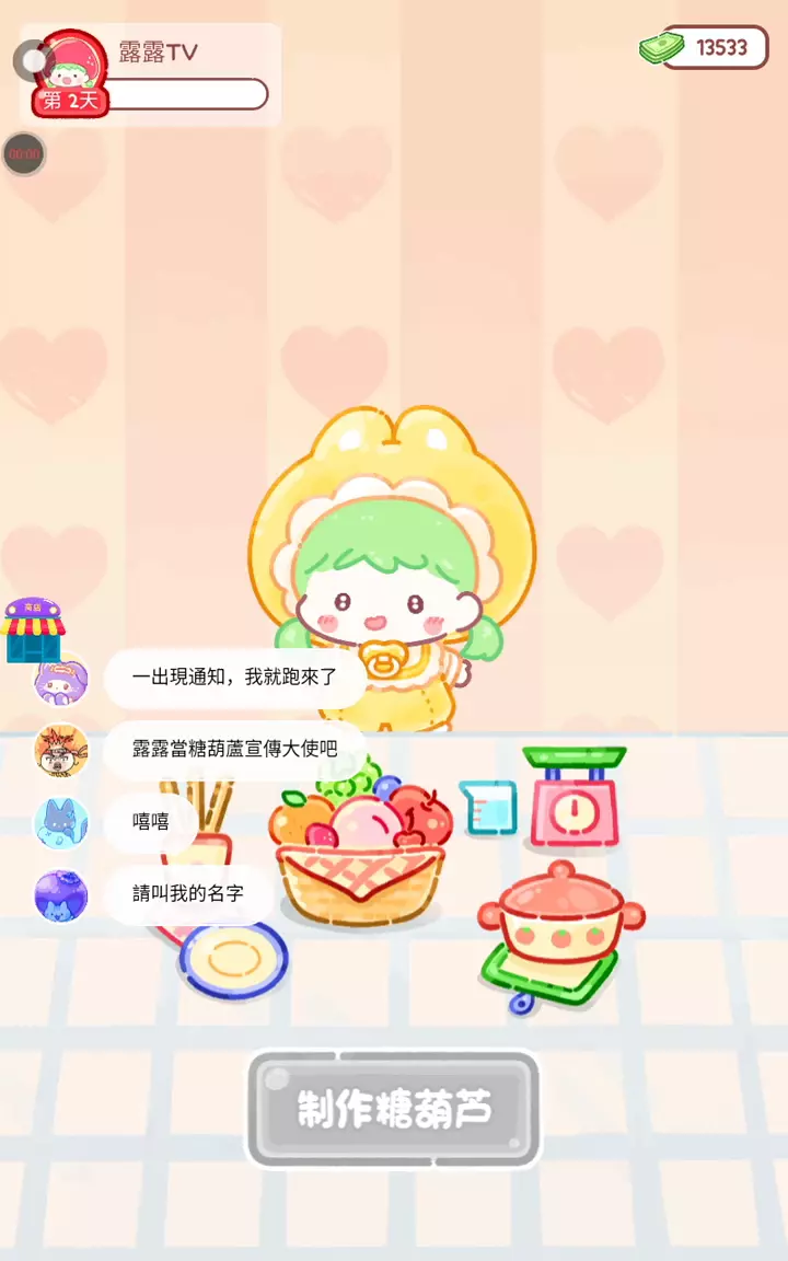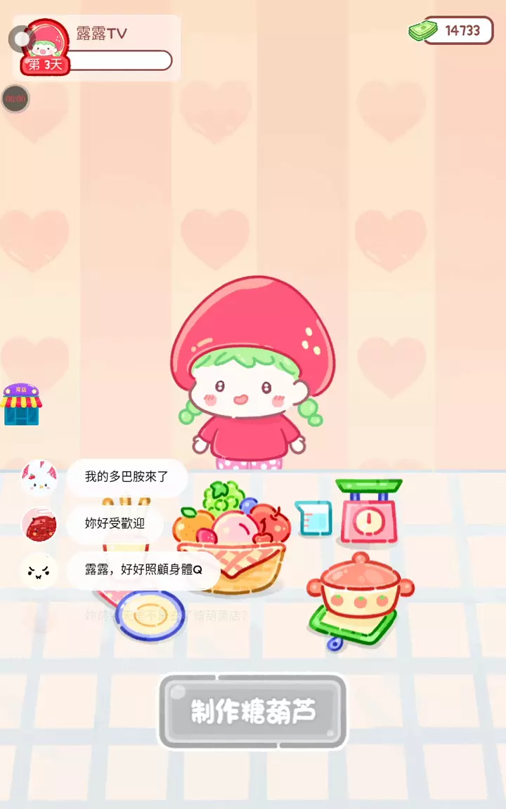 更新宠物!!! 「你进行草莓糖葫芦吃播的话,我就赞助100元。」 「脆口的声音太迷人了(°θ°)」 由于客人都被最近新开的许多糖葫芦店家抢走,曾经号称糖葫芦达人的父母因此卧病在床。 继承父母店面的主角露露开始糖葫芦吃播来宣传店面。 直到成为真正的糖葫芦达人那一天! 「今天我也要开始糖葫芦直播罗!( •o• )」 [串材料] 只有新鲜的水果的话,很难以一名吃播实况主存活下来。还要有松饼、地球软糖、青阳辣椒!利用奇特的材料制作糖葫芦吧。 [裹糖衣] 将材料串满竹签的话,就放进锅子搅动吧。唯有利用达人的秘法,才能裹出又薄又脆的糖衣。 [即时吃播] 咔哒咔哒!今天的吃播也大成功。热烈的聊天内容看起来反应也不错。看来得利用完成观众任务得到的赞助金来买新材料了! 来,准备好了吧?现在就马上挑战成为糖葫芦达人吧!