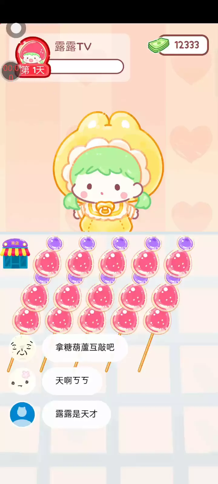 更新宠物!!! 「你进行草莓糖葫芦吃播的话,我就赞助100元。」 「脆口的声音太迷人了(°θ°)」 由于客人都被最近新开的许多糖葫芦店家抢走,曾经号称糖葫芦达人的父母因此卧病在床。 继承父母店面的主角露露开始糖葫芦吃播来宣传店面。 直到成为真正的糖葫芦达人那一天! 「今天我也要开始糖葫芦直播罗!( •o• )」 [串材料] 只有新鲜的水果的话,很难以一名吃播实况主存活下来。还要有松饼、地球软糖、青阳辣椒!利用奇特的材料制作糖葫芦吧。 [裹糖衣] 将材料串满竹签的话,就放进锅子搅动吧。唯有利用达人的秘法,才能裹出又薄又脆的糖衣。 [即时吃播] 咔哒咔哒!今天的吃播也大成功。热烈的聊天内容看起来反应也不错。看来得利用完成观众任务得到的赞助金来买新材料了! 来,准备好了吧?现在就马上挑战成为糖葫芦达人吧!