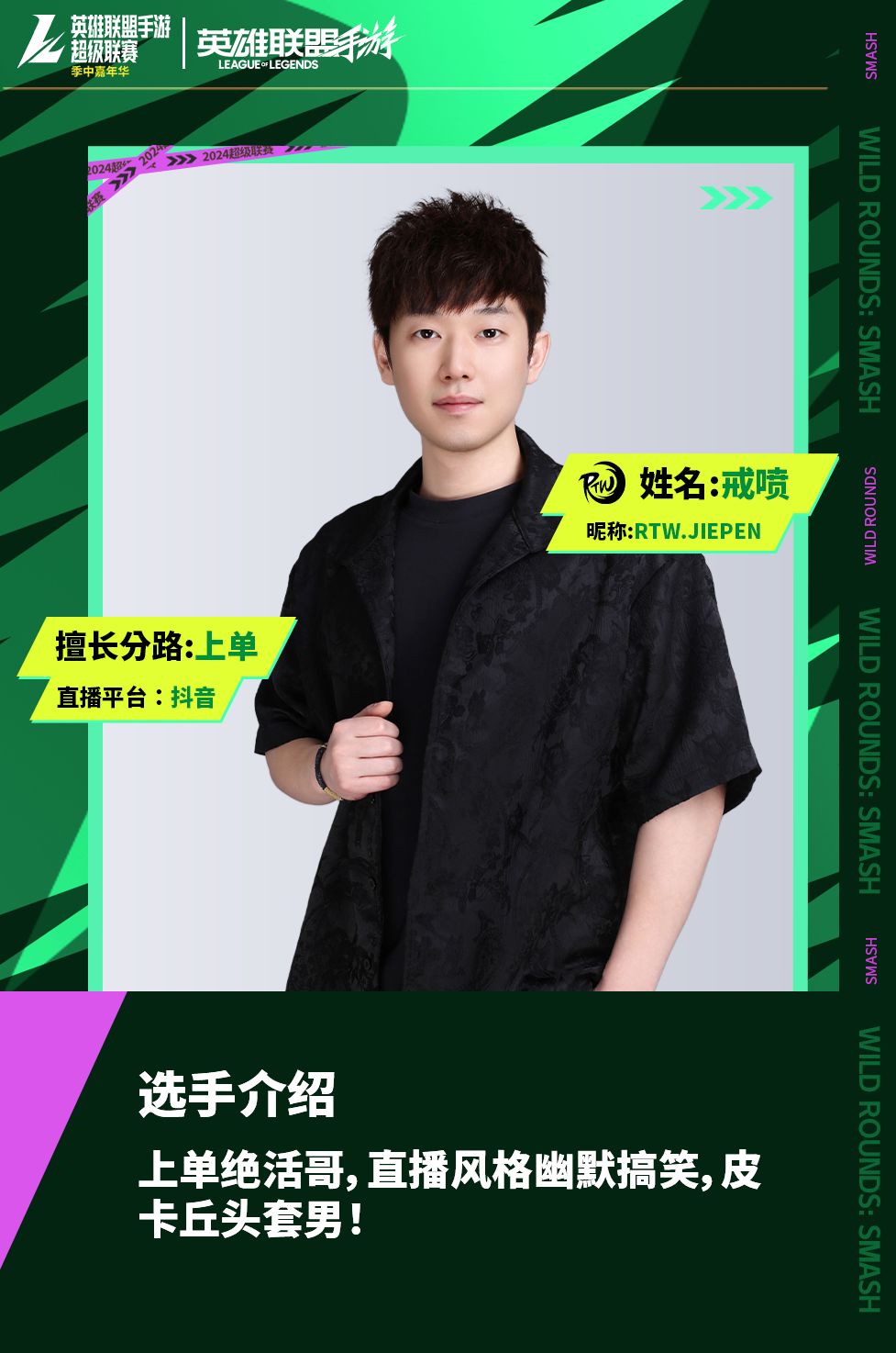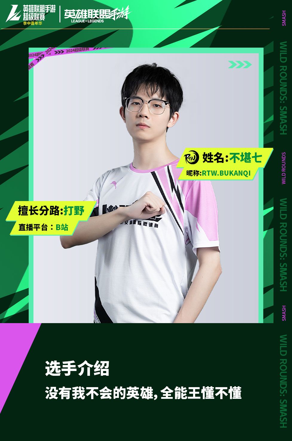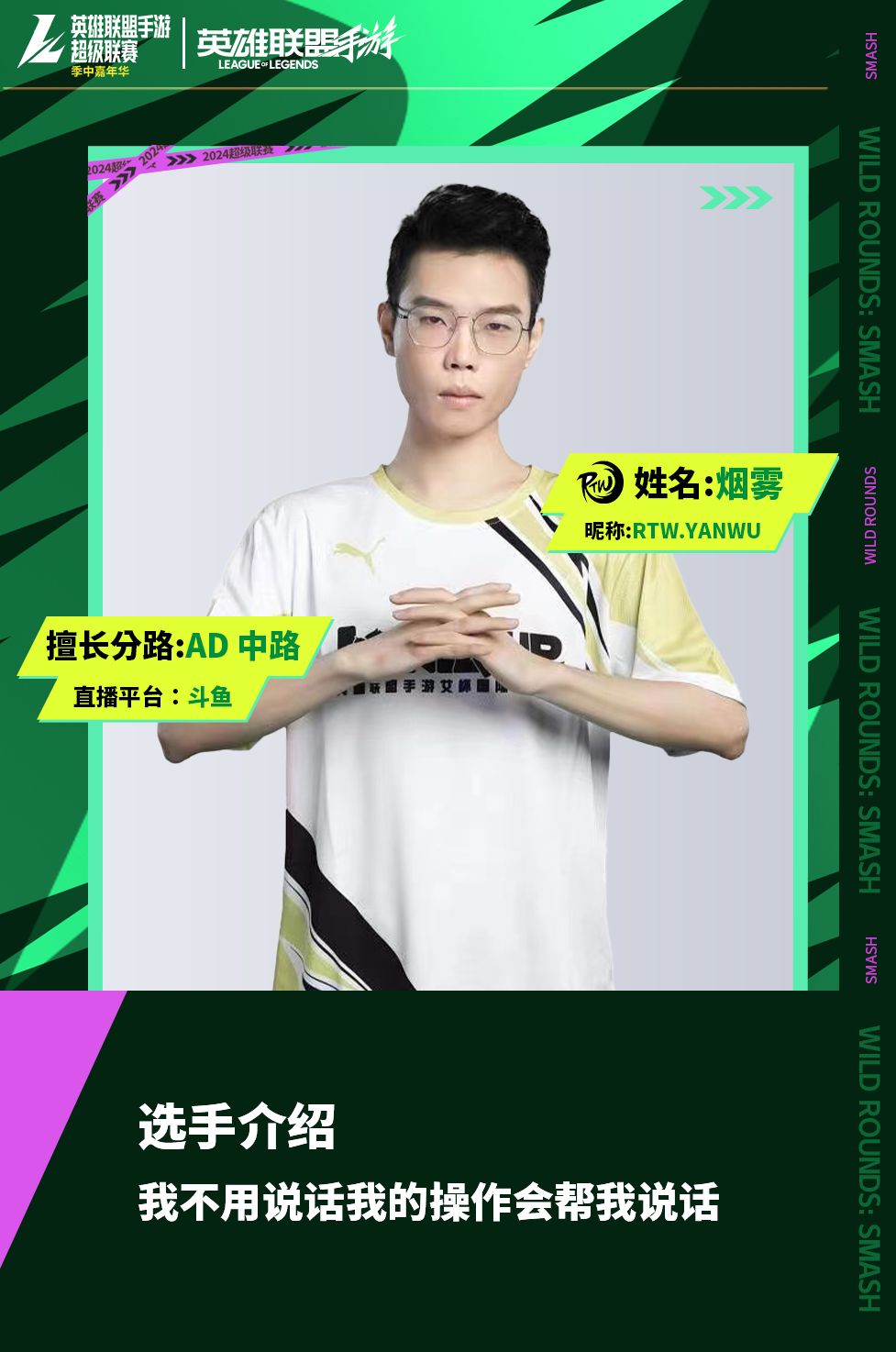 RTW破浪队由英雄联盟手游各平台高实力人气主播组成,前职业选手 YOLO、绝活上单 戒喷、国一狮子狗 梁小通、国一亚索 止戈、全能王 不堪七以及实力选手 烟雾,他们将会以极致的配合为我们带来最精彩的比赛!
