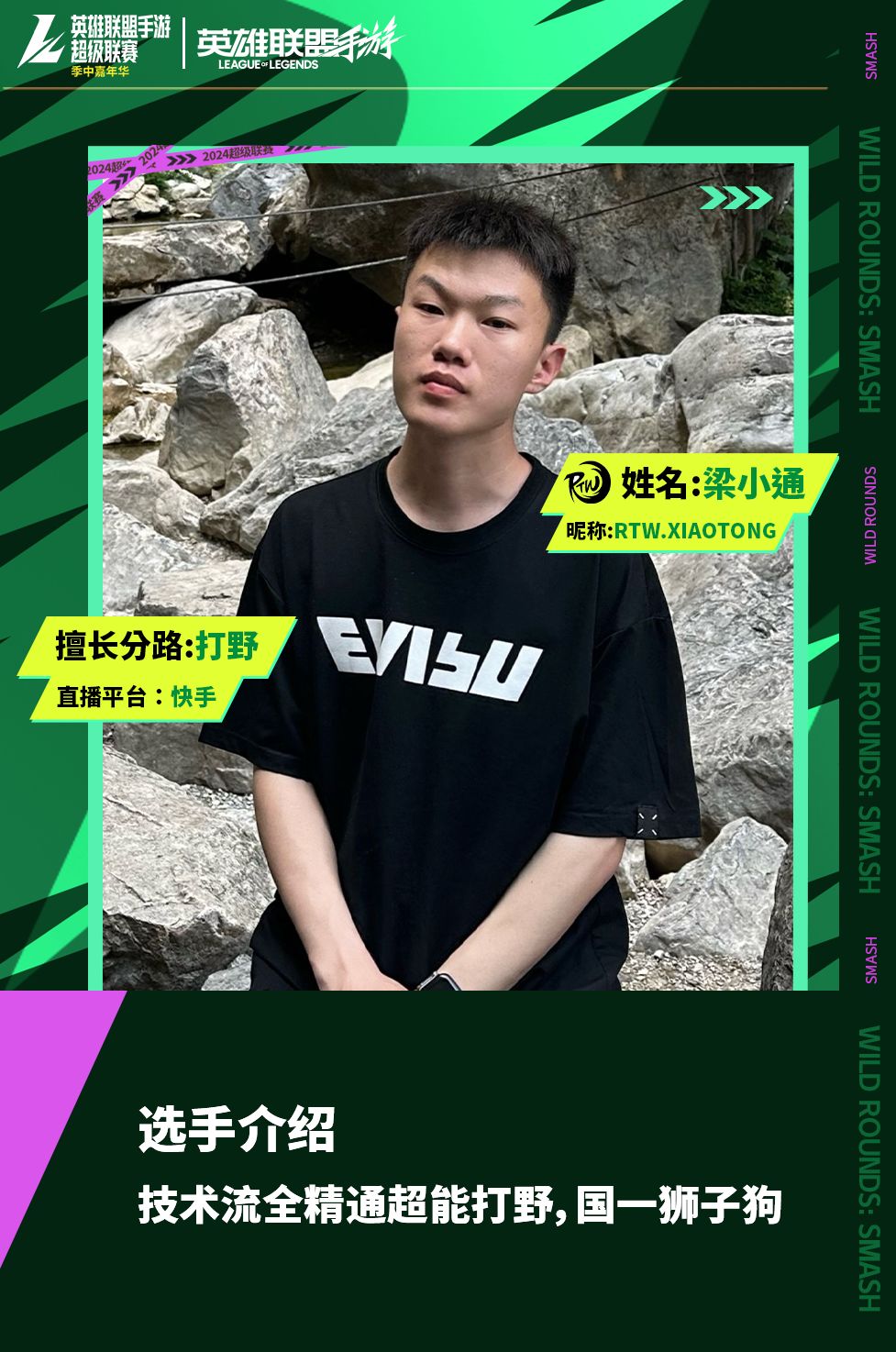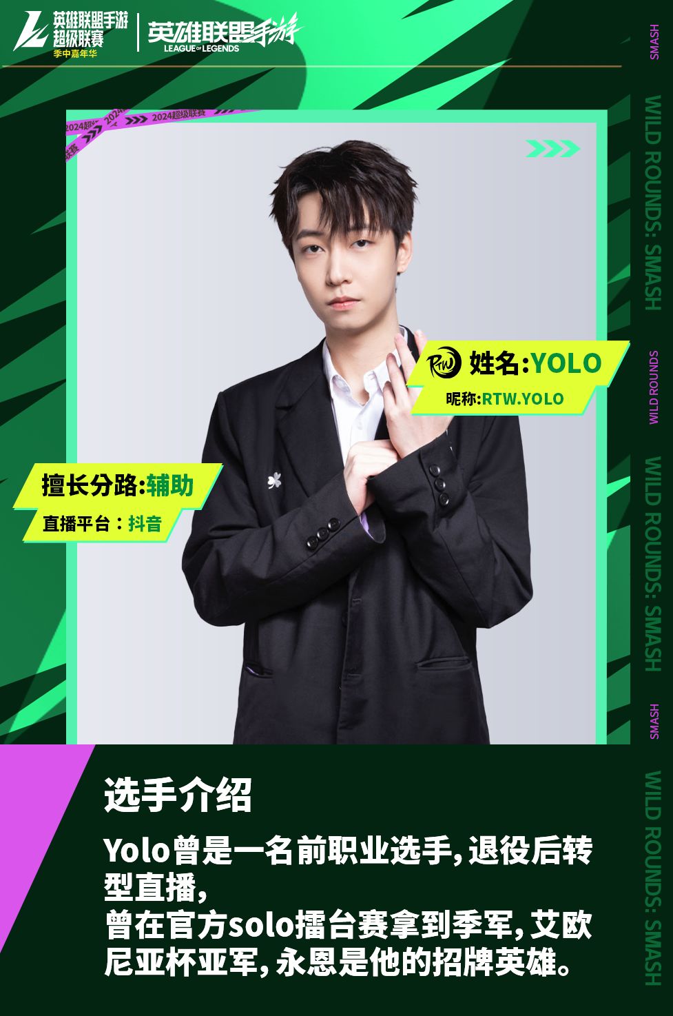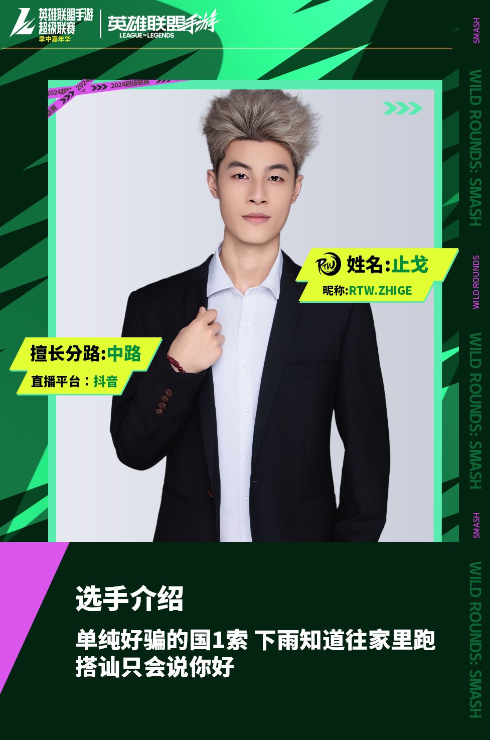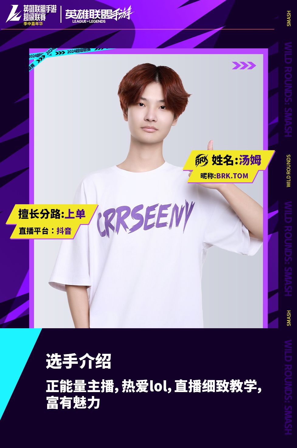 RTW破浪队由英雄联盟手游各平台高实力人气主播组成,前职业选手 YOLO、绝活上单 戒喷、国一狮子狗 梁小通、国一亚索 止戈、全能王 不堪七以及实力选手 烟雾,他们将会以极致的配合为我们带来最精彩的比赛!