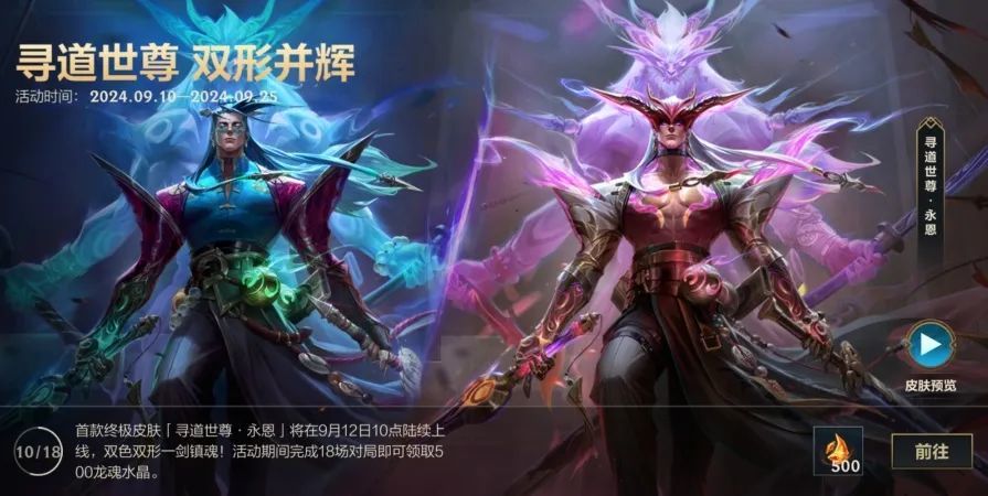 首款终极皮肤「寻道世尊 永恩」已上线峡谷,双色双形一剑镇魂!截止至9月25日,活动期间完成18场对局即可领取龙魂水晶*500好礼。