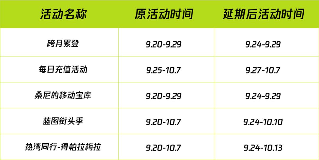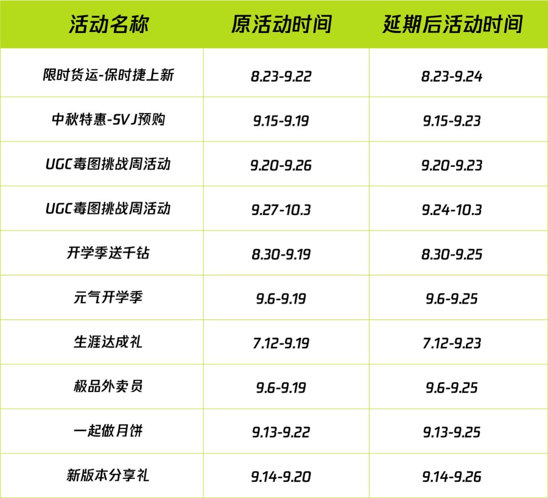 原定9月20日上线的新活动也相应延期上线: