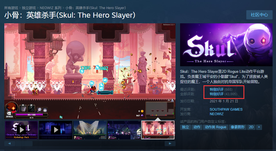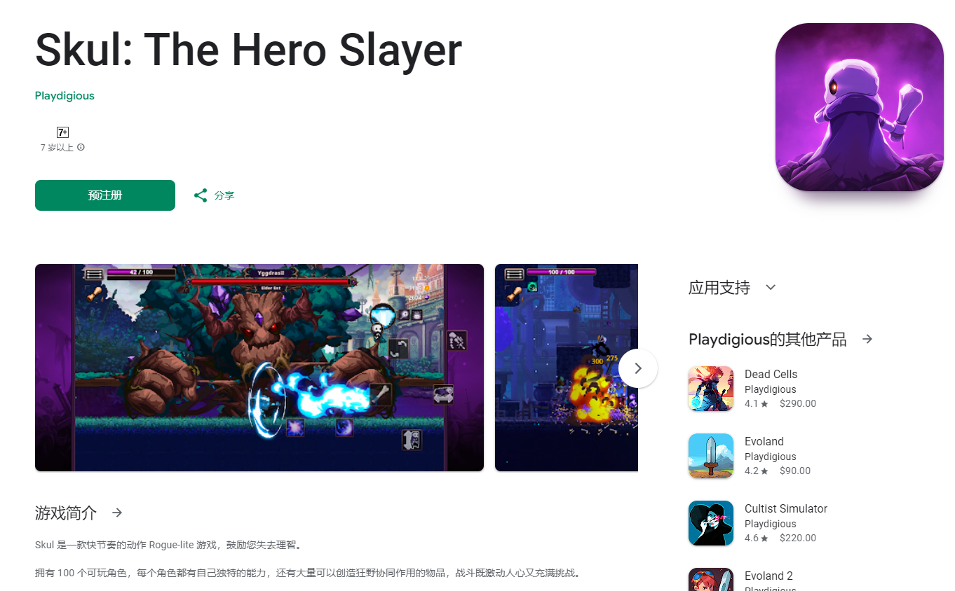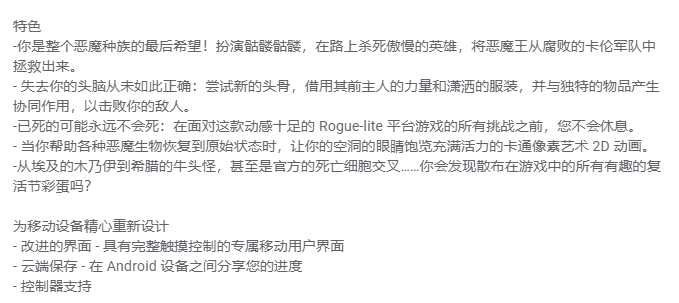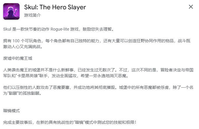 Steam特别好评动作肉鸽游戏《小骨:英雄杀手》已登录了海外谷歌商店,官方同步曝光将于6.4在海外安卓、IOS平台发售!