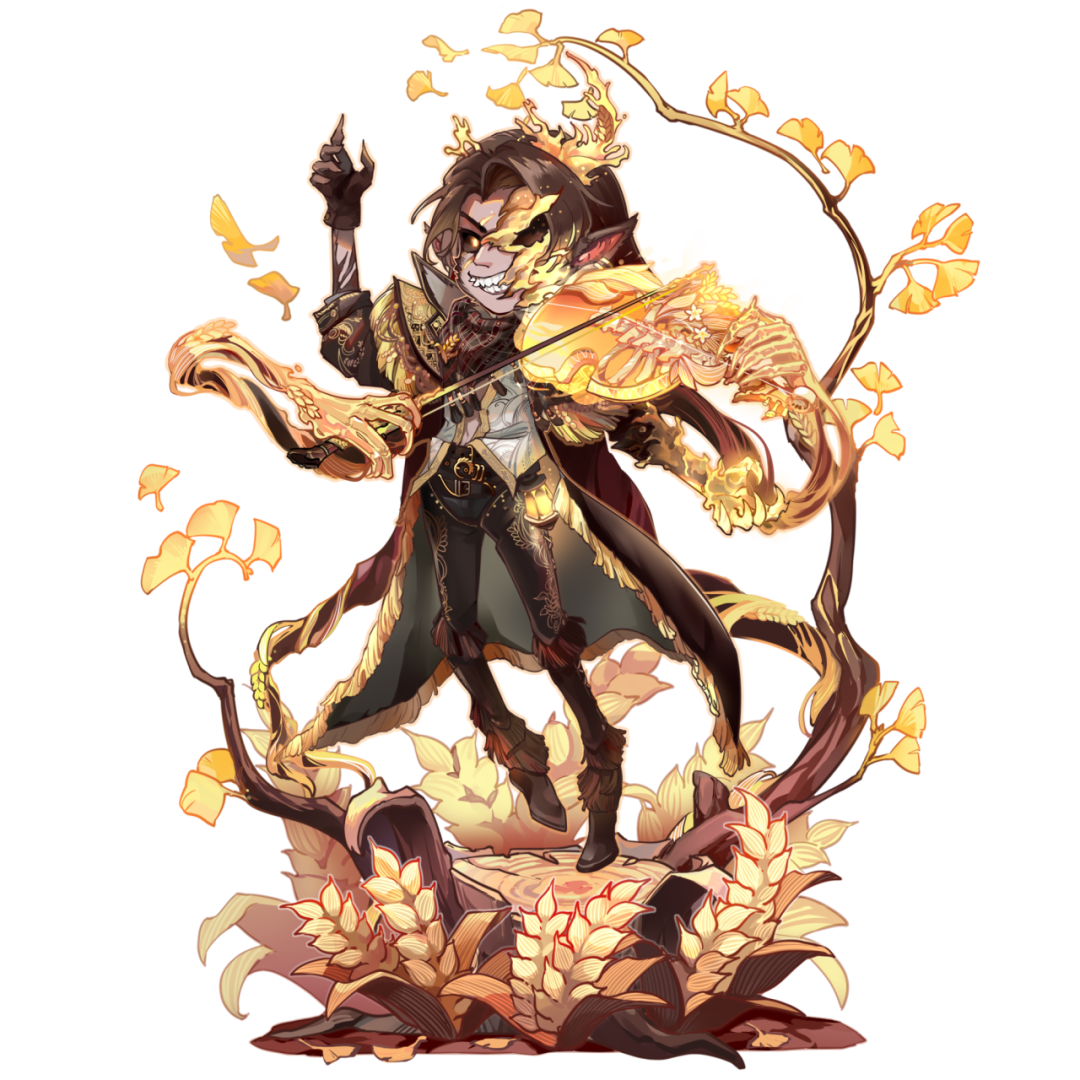 他慵懒地倚靠在吧台边,身旁华丽的金色提琴昭示着他的"胜利"。于畅饮之余掷出的金币落下,他从容地与魔鬼碰杯。