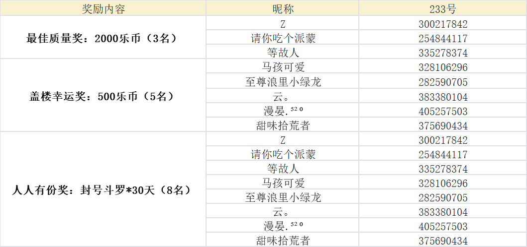 ps:最佳质量奖和盖楼幸运奖每位玩家只可获得其中一份,优先选取最佳质量奖玩家,如获奖玩家后续获得盖楼幸运。