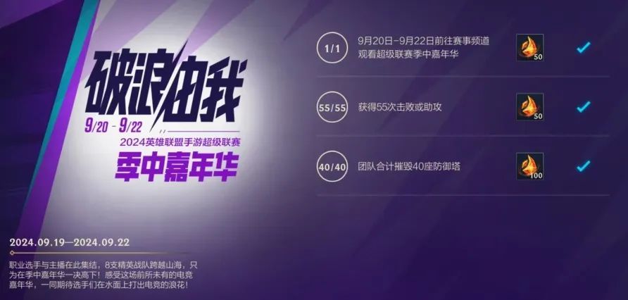 电竞狂欢,观赛有礼,2024英雄联盟手游超级联赛季中嘉年华今日正式开赛!截止至9月22日,召唤师前往赛事频道观看比赛,完成相应活动任务,即可领取龙魂水晶*200好礼~