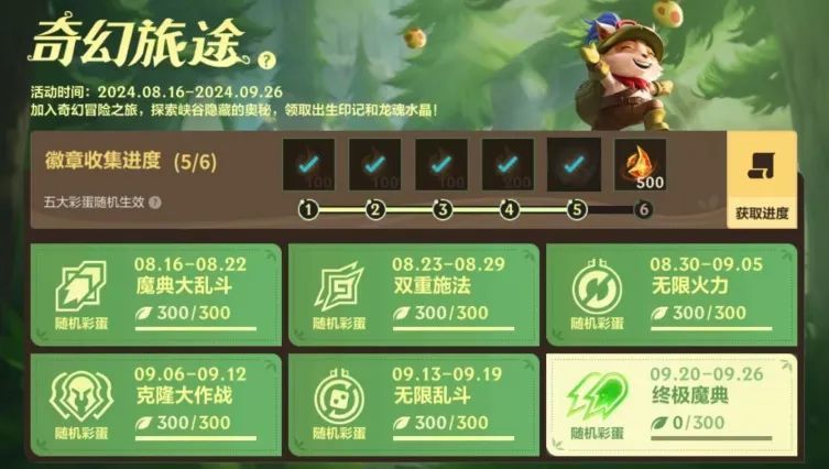 与此同时,奇幻旅途第六站今日同步开启!截止至9月26日,召唤师完成活动任务,即可助力徽章收集进度,离领取出生印记-新枝桃彩和龙魂水晶*2800奖励更进一步~