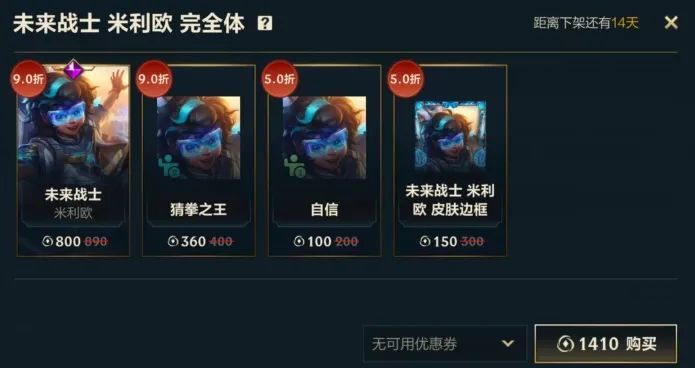 未来战士 米利欧 完全体礼包也在限时优惠出售中!即日起至10月3日23:59分,召唤师可使用1410点券的优惠价购入礼包,礼包内将包含9折优惠的未来战士 米利欧皮肤和姿态-猜拳之王,更有5折优惠的姿态-自信和皮肤边框-未来战士 米利欧!