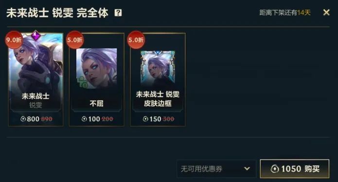 即日起至10月3日23:59分,召唤师只需以1050点券的优惠价格即可购入未来战士 锐雯 完全体礼包,礼包内包含9折优惠的未来战士 锐雯皮肤,更有5折优惠的姿态-不屈和皮肤边框-未来战士 锐雯。