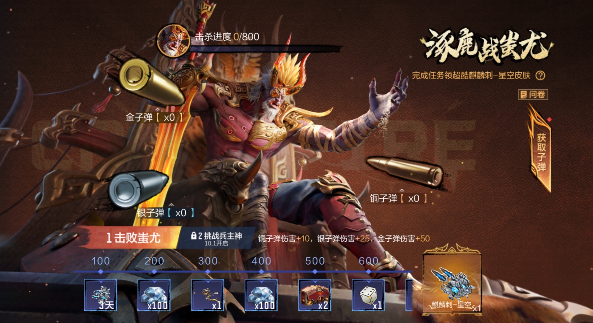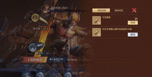 消耗子弹可以获取伤害值,不同材质的子弹获取的伤害值也不同。铜子弹一发可以获取10点伤害,银子弹一发可以获取25点伤害,金子弹一发可以获取50点伤害。获取子弹之后,玩家只需要点击活动界面对应的子弹图标,就会自动对蚩尤造成伤害,简单便捷,无任何压力负担。