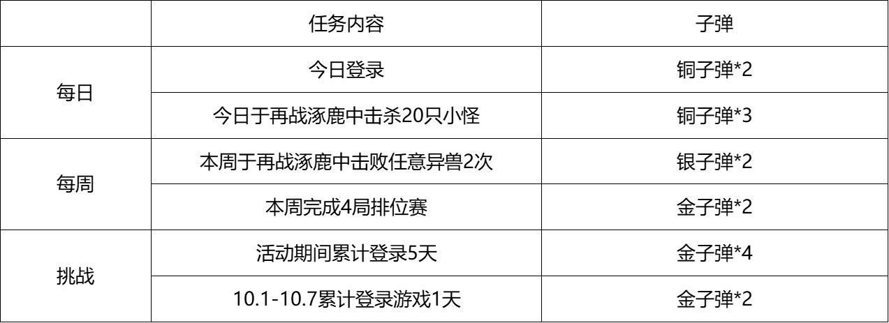 活动内的任务分为每日任务、每周任务以及挑战任务。完成不同的任务,可以获得不同数量,甚至不同材质的子弹。任务类型大致分为登录任务、排位任务以及挑战任务。登录任务毫无门槛。各位玩家只需留心每日登录游戏领取奖励即可。至于排位任务以及挑战任务,各位玩家可以根据自己的喜好进行选择,毕竟活动时间持续一个月之久,有足够的时间完成。具体的活动奖励以及需要累计达成的伤害值如下图表格所示。