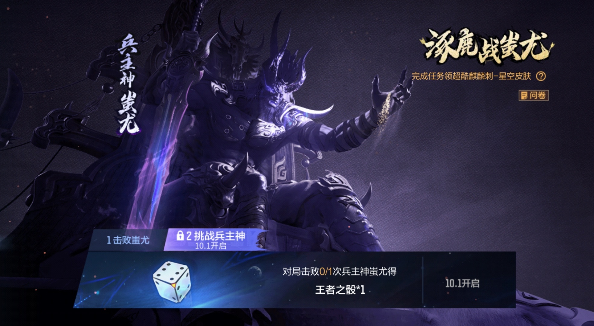 当伤害值累计达成击败之后,10月1日起,活动将开启第二阶段,玩家可以开启兵主神蚩尤的挑战,在对局中击败一次神蚩尤,即可获得一枚王者之骰。另外,提醒各位玩家,在10月1日之后,如果没有达成第一阶段累计伤害值击败蚩尤,将无法开启第二阶段,需要击败之后才能顺利开启。