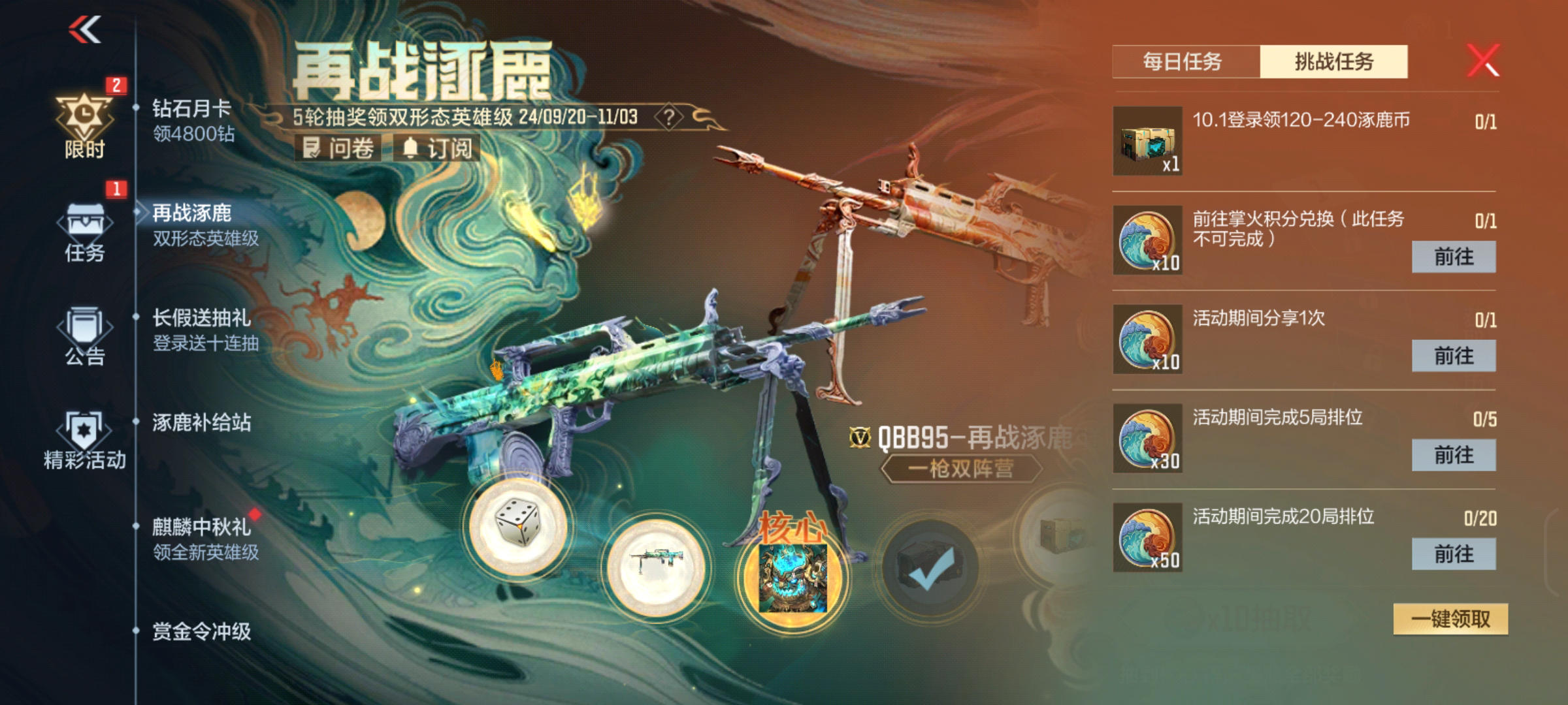 其中10月1日登录就能领取涿鹿币礼盒才是挑战任务的重头戏。我们按时登录并开启礼盒就可以获取到120~250个涿鹿币。保底也能直接抽满两轮奖励,大家一定不要忘了参与该活动。