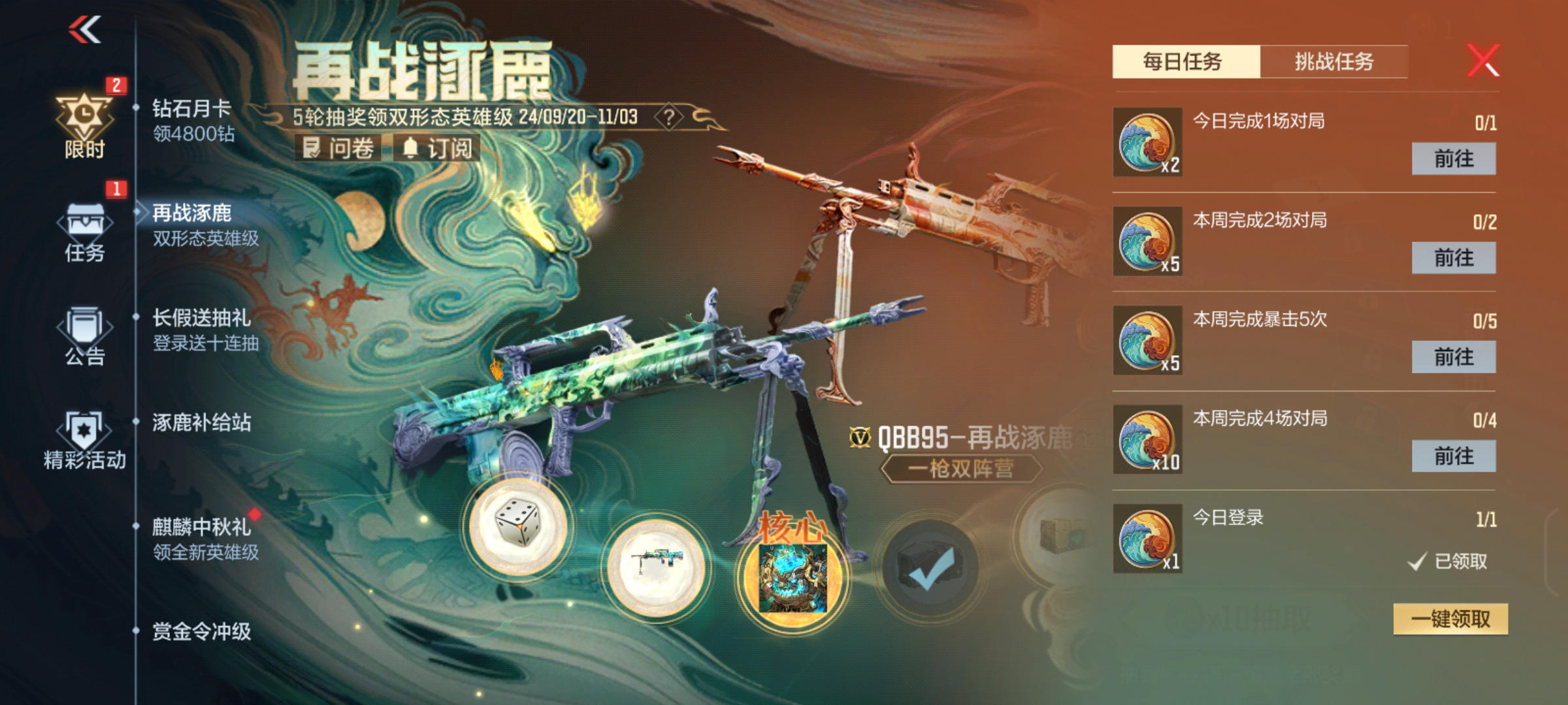 再战涿鹿活动已于9月20日正式开放,其任务内容分为每日任务和挑战任务两个模块。其中每日任务的都是登录游戏,完成对局这样的简单任务,难度较低。我们每周做满每日任务能获取到涿鹿币*33个。