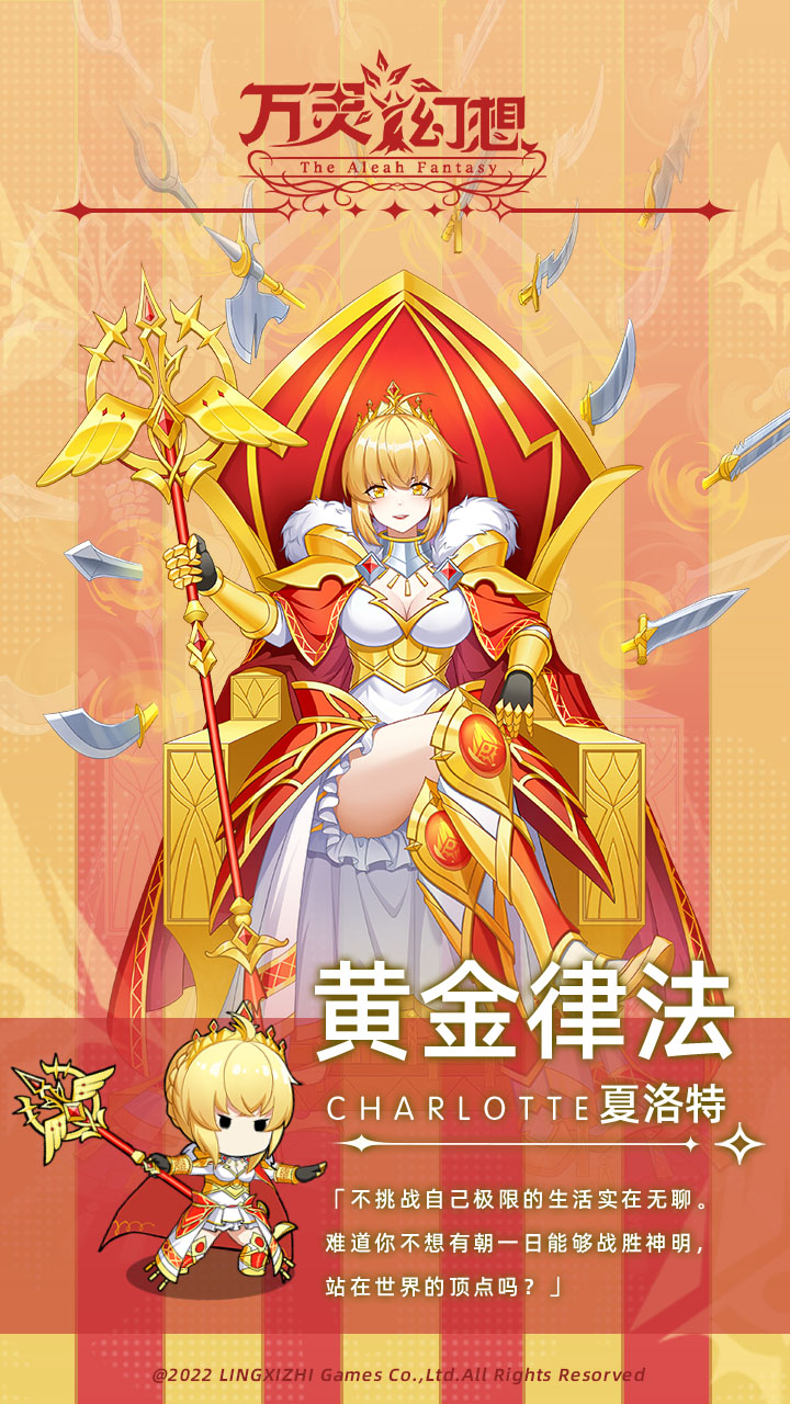 夏洛特是一位性格高傲的少女,这般性格自然是源于其自身强大的实力,她曾单枪匹马击退灾厄级侵蚀之影—饥荒骑士,光之界层除了能启动灭城级魔法的弧光骑士团团长的威斯之外几乎无人能敌她。热爱挑战极限的她在驻守黄金宫以前,是个游历世界寻找强敌对战的自由之人,并在各个界层间声名鹊起。自傲的少女终究还是犯了轻敌的毛病,她竟独自向光之界层的原初守护者瓦伦汀发起挑战。结果显而易见,她失败了。原初守护者的强大令人无法想象,夏洛特输得心服口服。原初守护者瓦伦汀考虑到守护黄金宫责任重大,夏洛特又拥有如此实力,便与她签下契约,让她负责管理和守护黄金宫。
