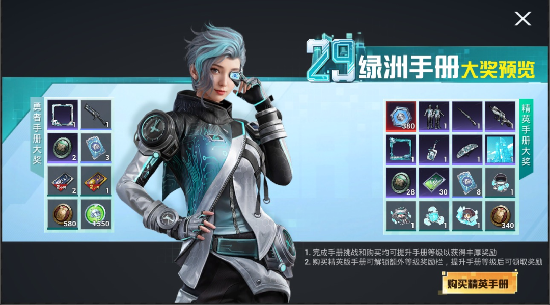 各位特种兵可以将勇者手册升级为精英手册,购买精英手册可解锁额外等级奖励栏,还有机会获得专属套装,让你成为绿洲启元中最耀眼的存在。