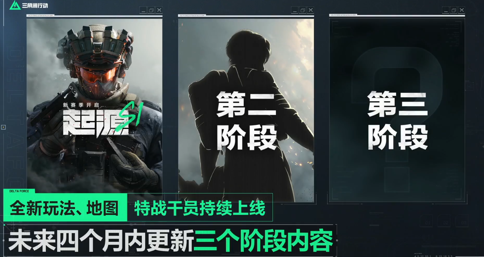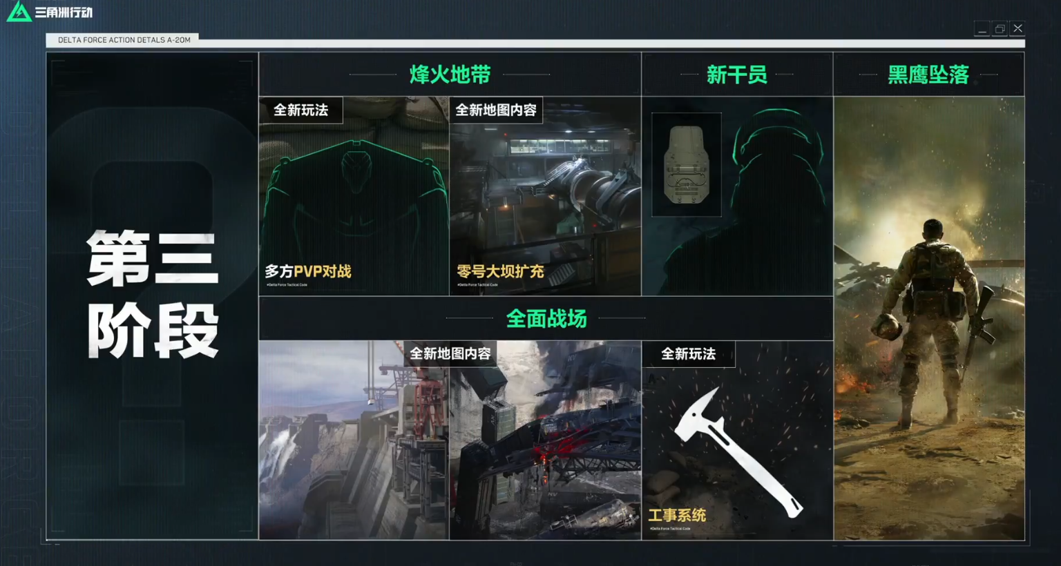 第三阶段,围绕【烽火地带】模式游戏将推出一个多方PVP的对战玩法;一个战术装备是全身盾牌的全新干员;以及之前宣传许久的PVE玩法【黑鹰坠落】战役模式。