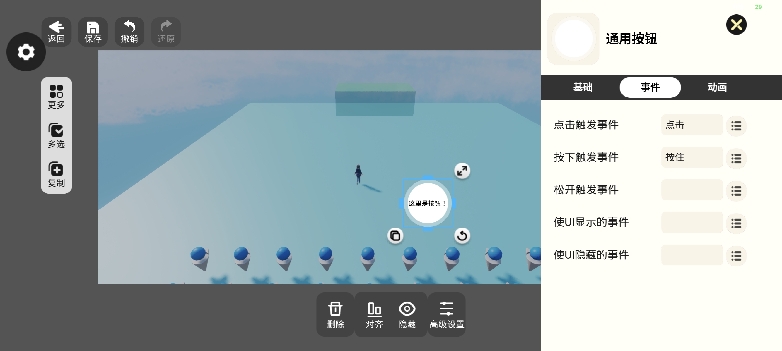 👇这个是编辑界面的样式,可以在高级设置-事件中设置按钮相关的触发事件~
