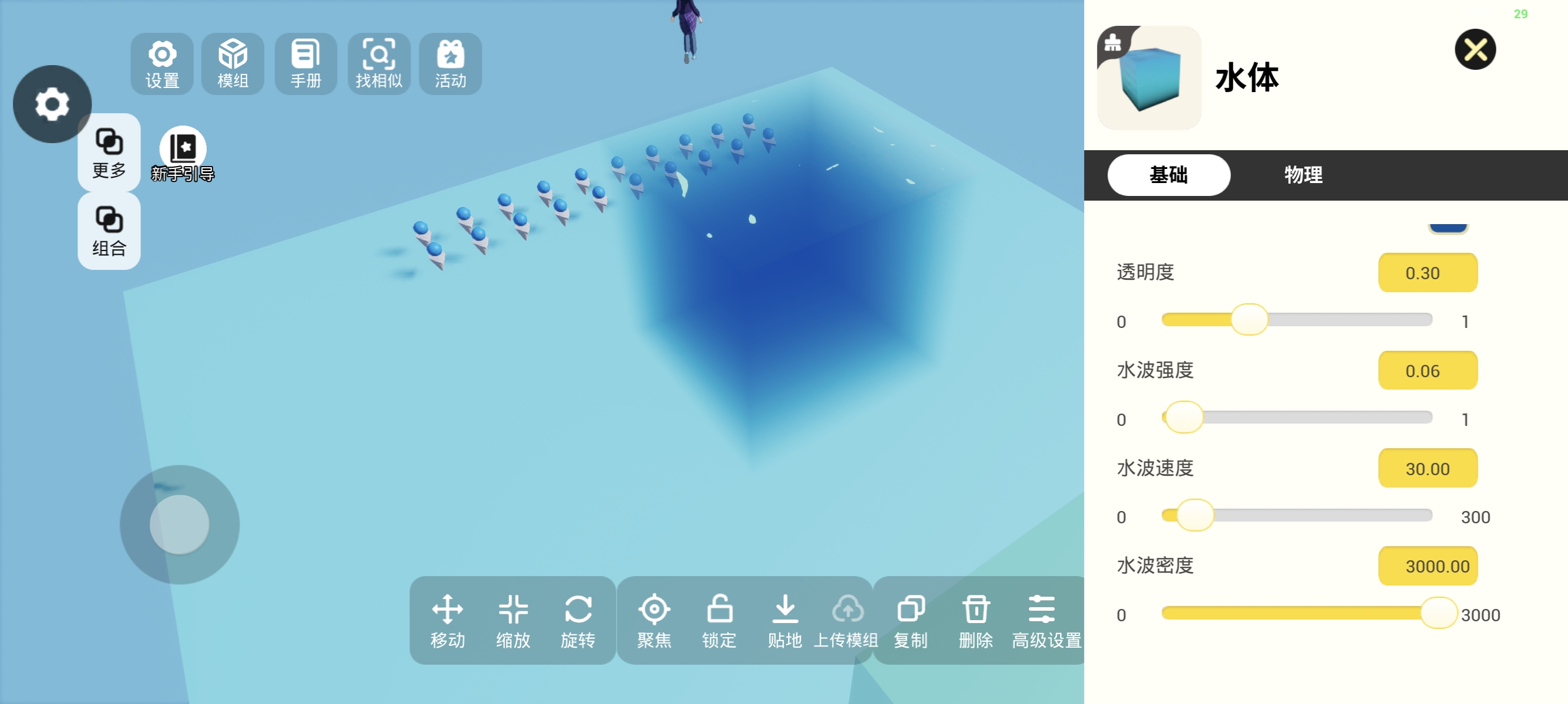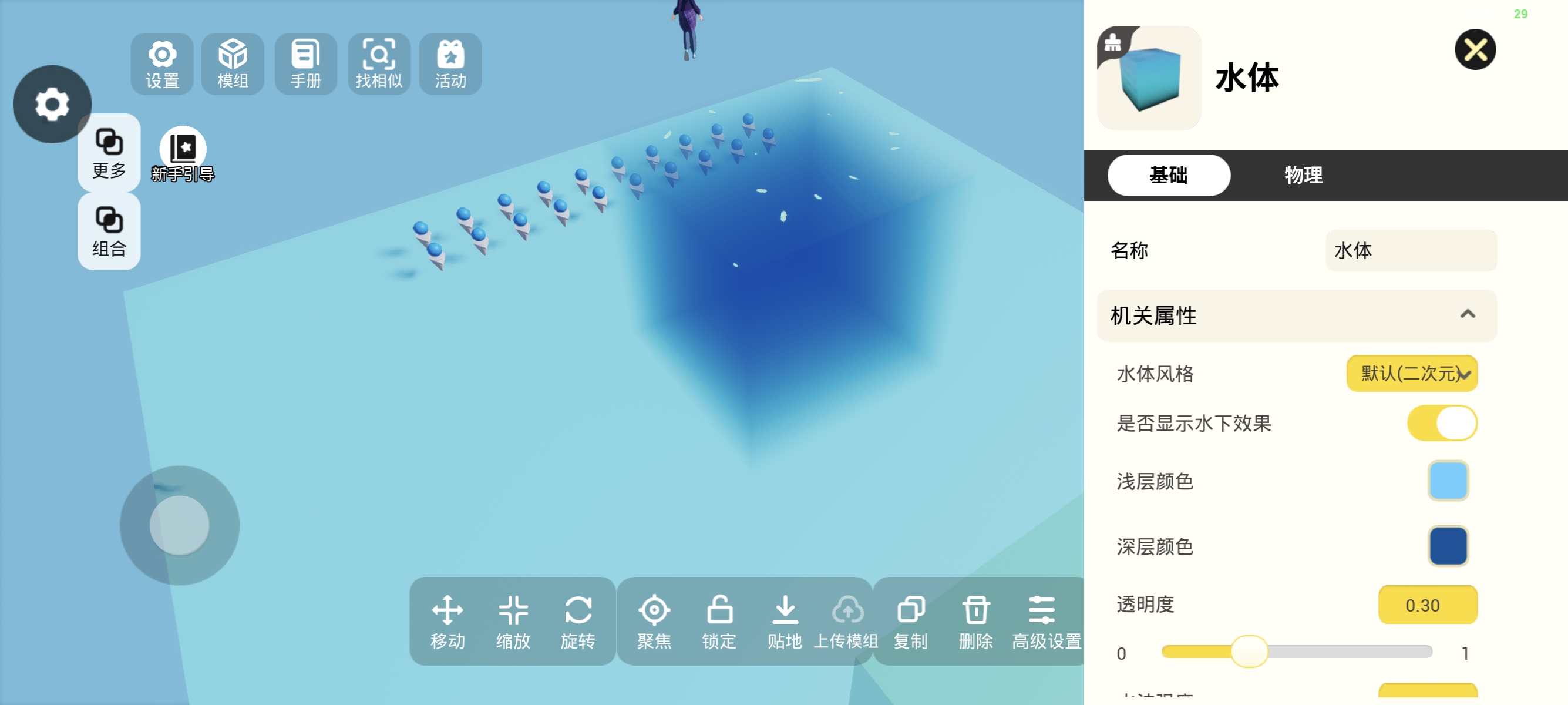 水体功能全面更新啦!除了能够游泳外,还新增了属性设置,不仅可以设置水体的风格,还可以设置水波的显示!
