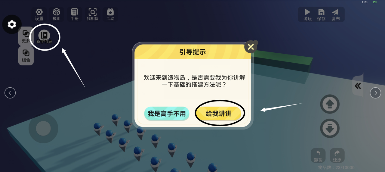 由于造物岛最近涌入了较多的新玩家~游戏内特地加上了新手引导功能,里面有一些造物岛的基础操作教学,大家可以根据自己的需要去游戏内体验。