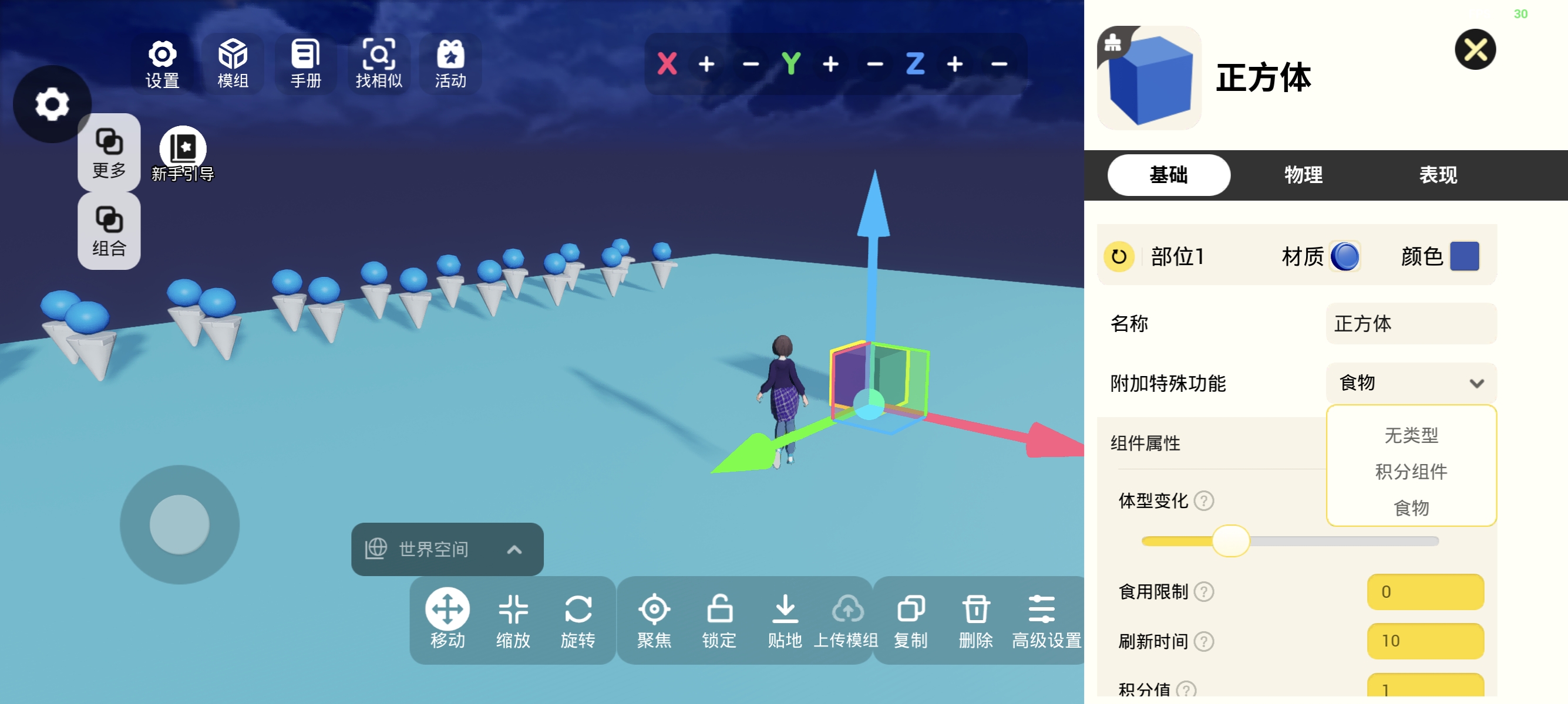 选择任意基础物体或者模型资源,点击【高级设置】-【附加特殊功能】【食物】,物体就会被赋予食物功能,游玩的时候靠近这个物体,就会多出一个食用按钮,点击后就可以把这个物体吃了!来增加角色的体型