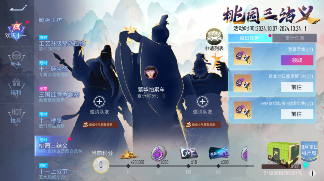 三国特训,小队集结。10月7日~10月24日,王牌车队集训限时开启,与好友一起组成3人小队,完成任务可积攒小队积分。累计小队积分可获得万能零件、传说蓝图碎片等道具奖励!训练活跃的小队更有机会解锁额外大奖,赢取传说蓝图自选包等稀有奖励。快召集王牌车手们一起训练吧!