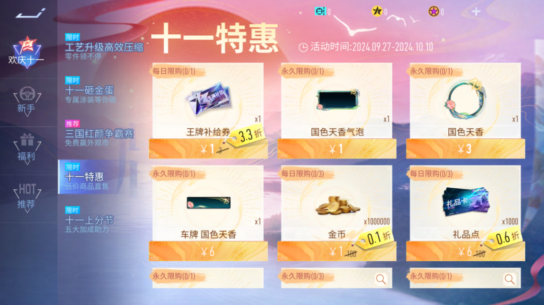 十一特惠商店开张啦!9月27日~10月10日期间 超多商品低价出售,最低1元!最低1元!各位车手可千万不要错过!