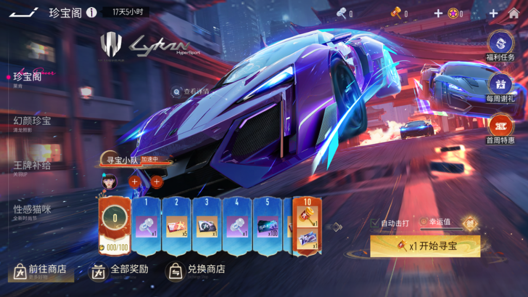『莱肯珍宝阁』本次活动共分为珍宝战令、探宝小队、宝藏商店、宝库寻宝四大玩法,车手们不仅可以在其中抽取莱肯 HyperSport车辆及限定时装/涂装奖励,通过提升战令等级,还能解锁更多珍宝好礼。
