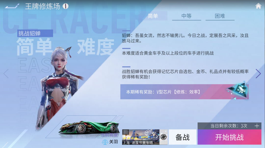 『玩法简介』在修炼场中车手们可以驾驶竞速赛车在指定地图向貂蝉、吕布、孙尚香发起挑战,每次挑战开始前可随机获得一个专属技能,若挑战成功将有机会获得修炼V型芯片、记忆芯片自选包等稀有奖励!