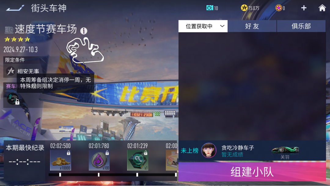 街头车神『速度节赛车场』将于2024年9月28日8:00开启,无规则限制。