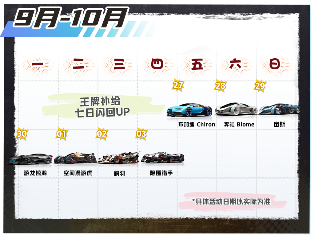 七日闪回惊喜不停!9月27日~10月3日,王牌补给将开启特别活动——七日闪回!每天都会有一辆传说车辆限时概率提升66%,快快拿下自己心仪的爱车吧:9月27日布加迪 Chiron概率提升,9月28日奔驰 Biome概率提升,9月29日宙斯概率提升,9月30日游龙惊鸿概率提升,10月1日空间漫游虎概率提升,10月2日鹤羽概率提升,10月3日隐匿猎手概率提升!