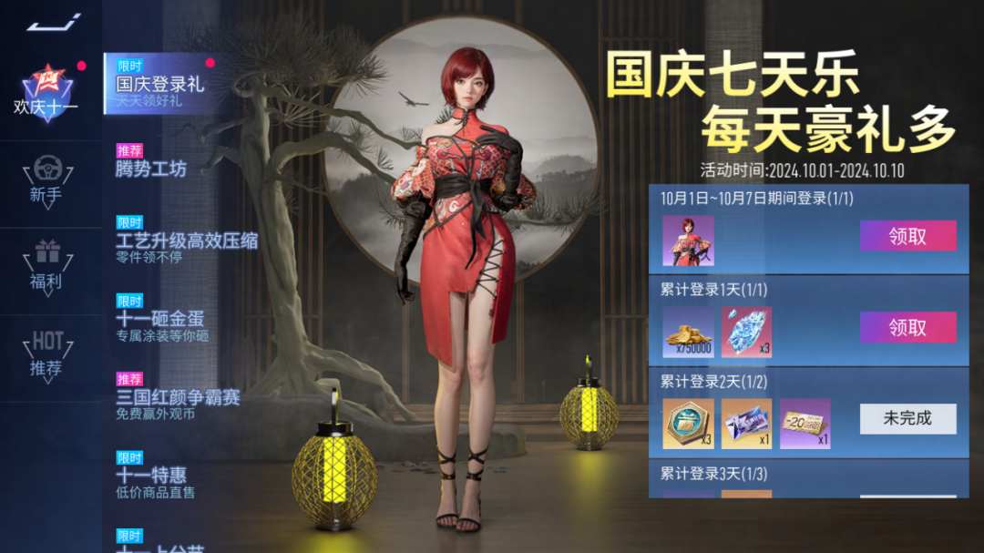 国庆七天乐,每天豪礼多!10月1日~10月10日 累计登录速度节,每天都可以领取好礼。王牌补给券、外观币、传说蓝图碎片、幻颜晶体,都在速度节等你!其中10月1日~7日期间登录可以领取时装:龙绣纹华套装。