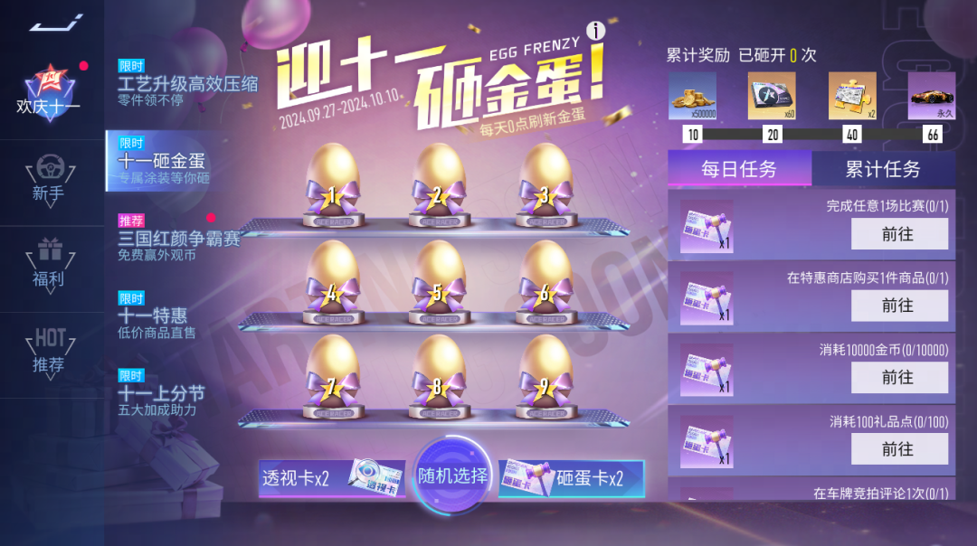 迎十一,砸金蛋。9月27日~10月10日,每天都会刷新9颗金蛋,砸开金蛋即可获得其中的奖励。各位车手可完成任务免费获得“透视卡”和“砸蛋卡”。金蛋中可能出现的奖励:传说蓝图碎片、十连采购券、III级芯片礼包、福利金币、王牌补给券、外观币等。每天参与砸蛋还可以领取累计砸蛋奖励:采购券、万能零件、传说蓝图碎片、布加迪 chiron全新涂装 国风之潮 等你来领!