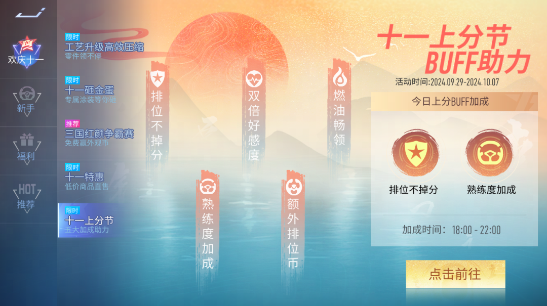 十一上分节,五大buff来助力,9月29日至10月7日,每晚18:00-22:00登录游戏即可享受排位不掉分、额外排位币、双倍好感度、熟练度加成、燃油畅领等不同加成奖励。每日开启的加成效果不同,记得上线查看哦!