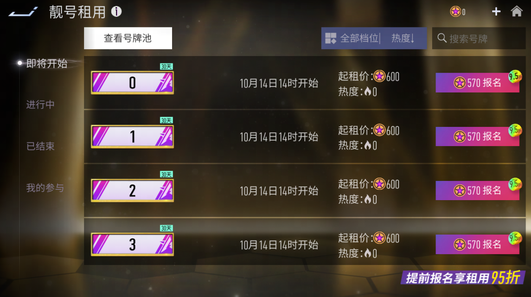 9月27日-10月26日,每天都有全新靓号上架租用活动,所有车手均可报名参与,本次活动所有靓号均为4位及以下纯数字号牌的30天使用权,号牌全服唯一。