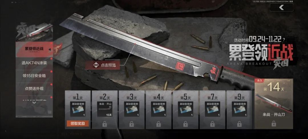 来战·开山刀免费送!9月24日~11月22日期间,参与每日登录活动,即可领取近战武器和基础套装券,若先锋们昨天已经登录过,今天便可以解锁来战·开山刀15天体验卡,累积登录14天就能将【来战·开山刀】(永久)收入囊中!