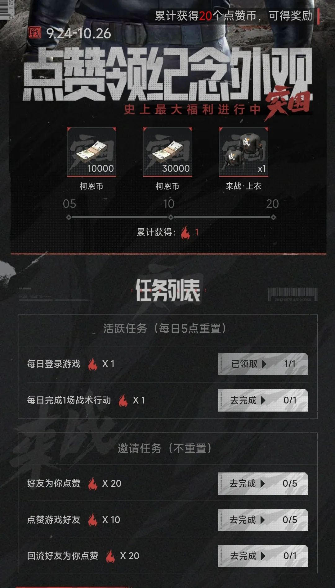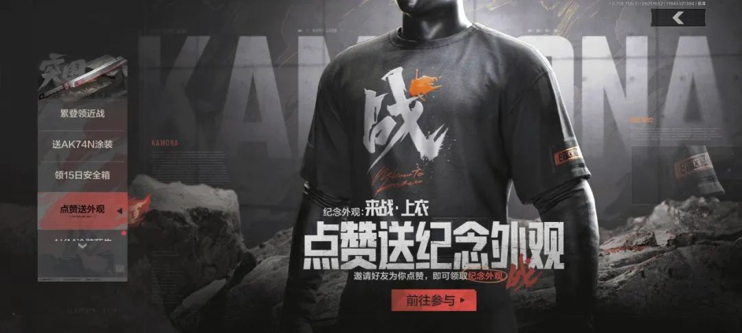【来战·上衣】诚意来袭,邀请好友点赞即可免费获赠这套纪念外观。点击游戏内参与按钮,前往活动页面完成活跃任务、邀请好友点赞便可领取,邀请回流好友点赞,一次即可达成领取条件,赶紧呼唤列表中的好友来助战吧!活动奖励将通过游戏邮件发放,先锋们别忘了去游戏邮箱中领取哦。