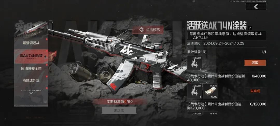 9月24日~10月25日,完成活跃任务将可积累战意值,战意值达成进度(60点)即可免费领取枪械涂装【来战·AK74N】!完成任务还可获得柯恩币奖励。