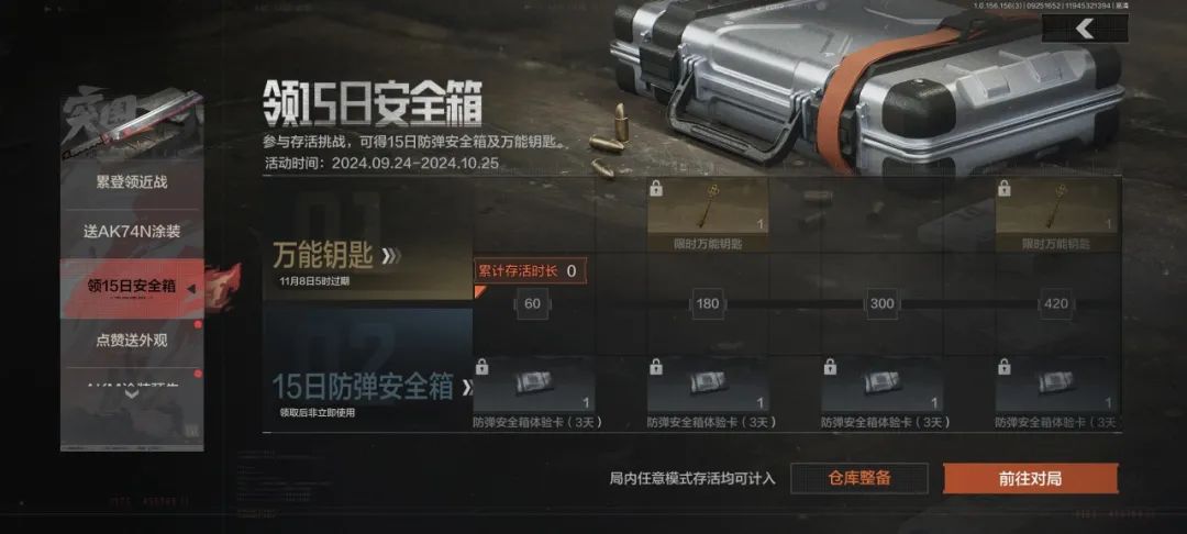9月24日~10月25日活动期间,只需累计局内存活时长,先锋们便可领取限时万能钥匙和防弹安全箱3天体验券,最多可领取总计2个万能钥匙和5张体验券。长达15日的免费安全箱,给你满满安全感!