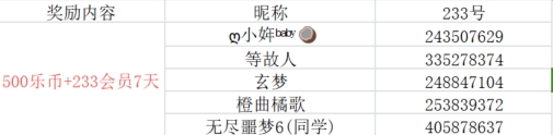 随机抽取5位星宝,送出500乐币+233乐园会员*7天