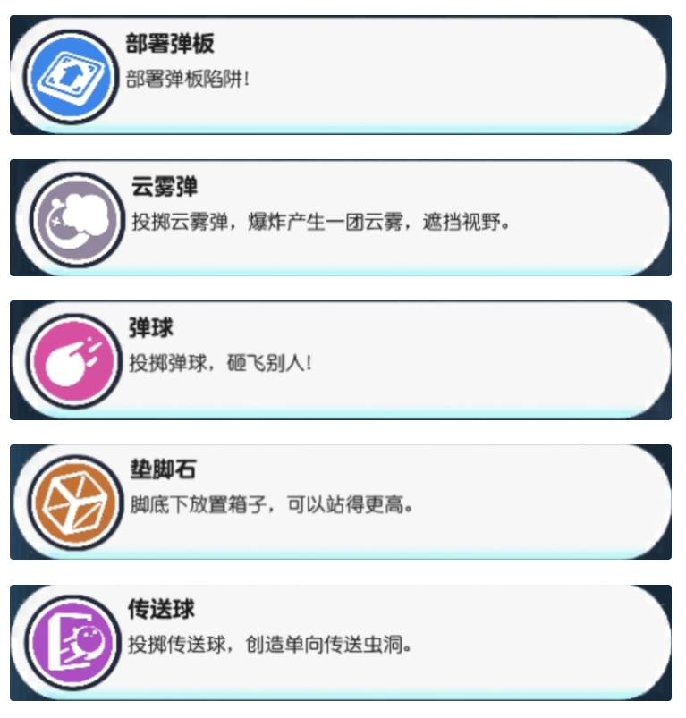 ⑤传送球:投掷传送求,将创造单向传送门,可利用传送球帮助自己快速跨过一小段路程或躲过障碍