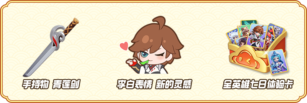 包括手持物 青莲剑、李白表情 新的灵感以及7、8、9月全英雄七日体验卡等。